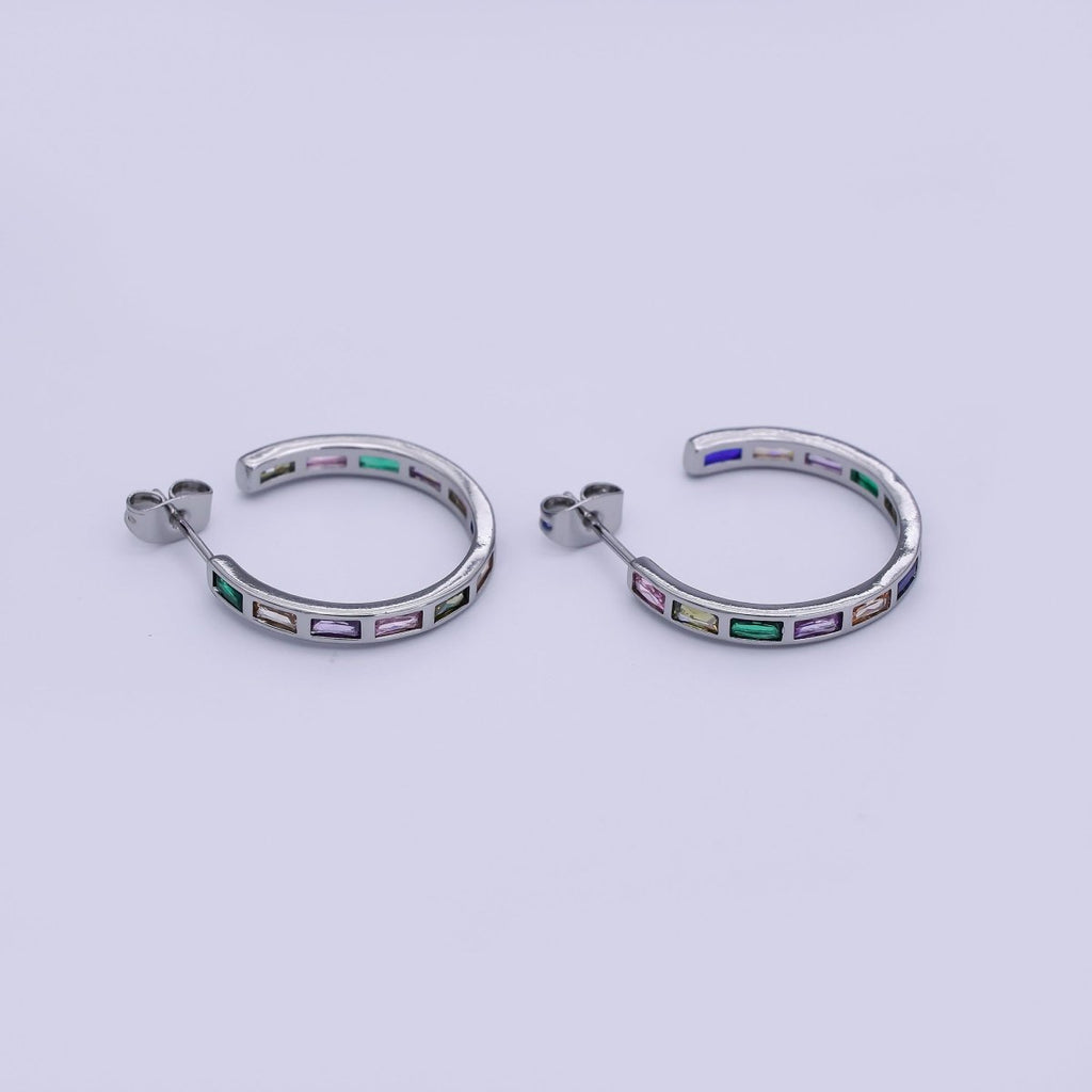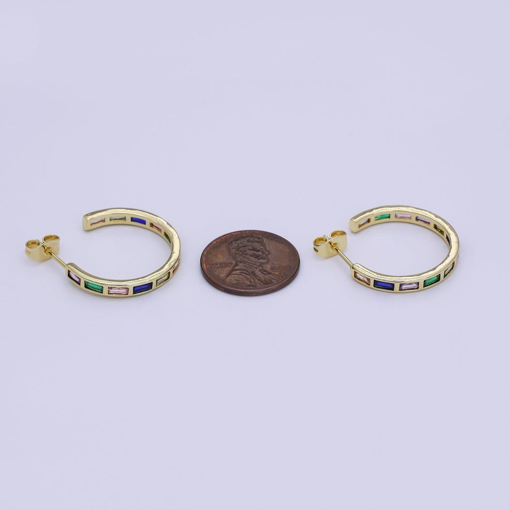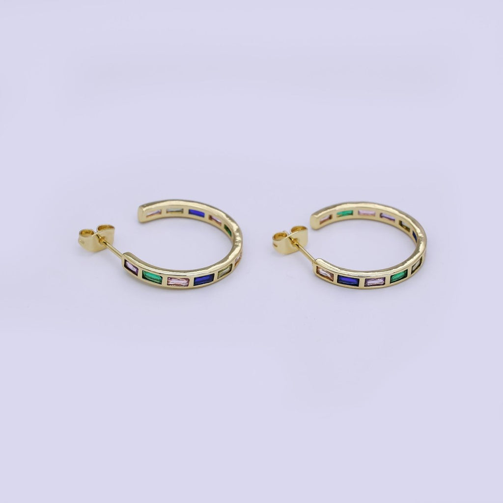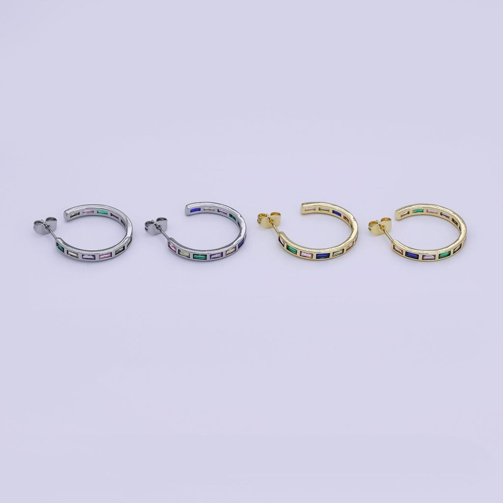 24K Gold Filled Baguette CZ Prismatic Multicolor C-Shaped Stud Earrings in Gold & Silver | AJ026 AJ027