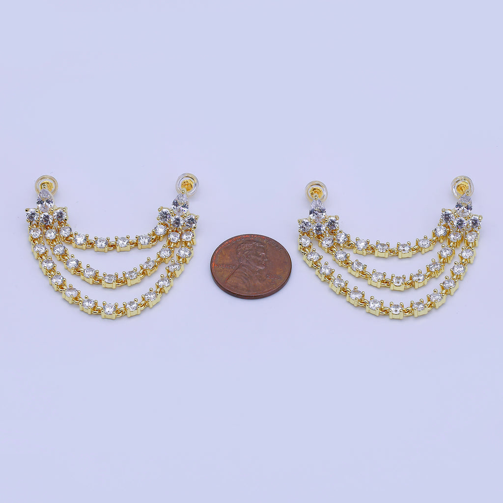 24K Gold Filled Clear CZ Triple Tennis Chain Drop Double Stud Earrings in Gold & Silver | V148 Q440