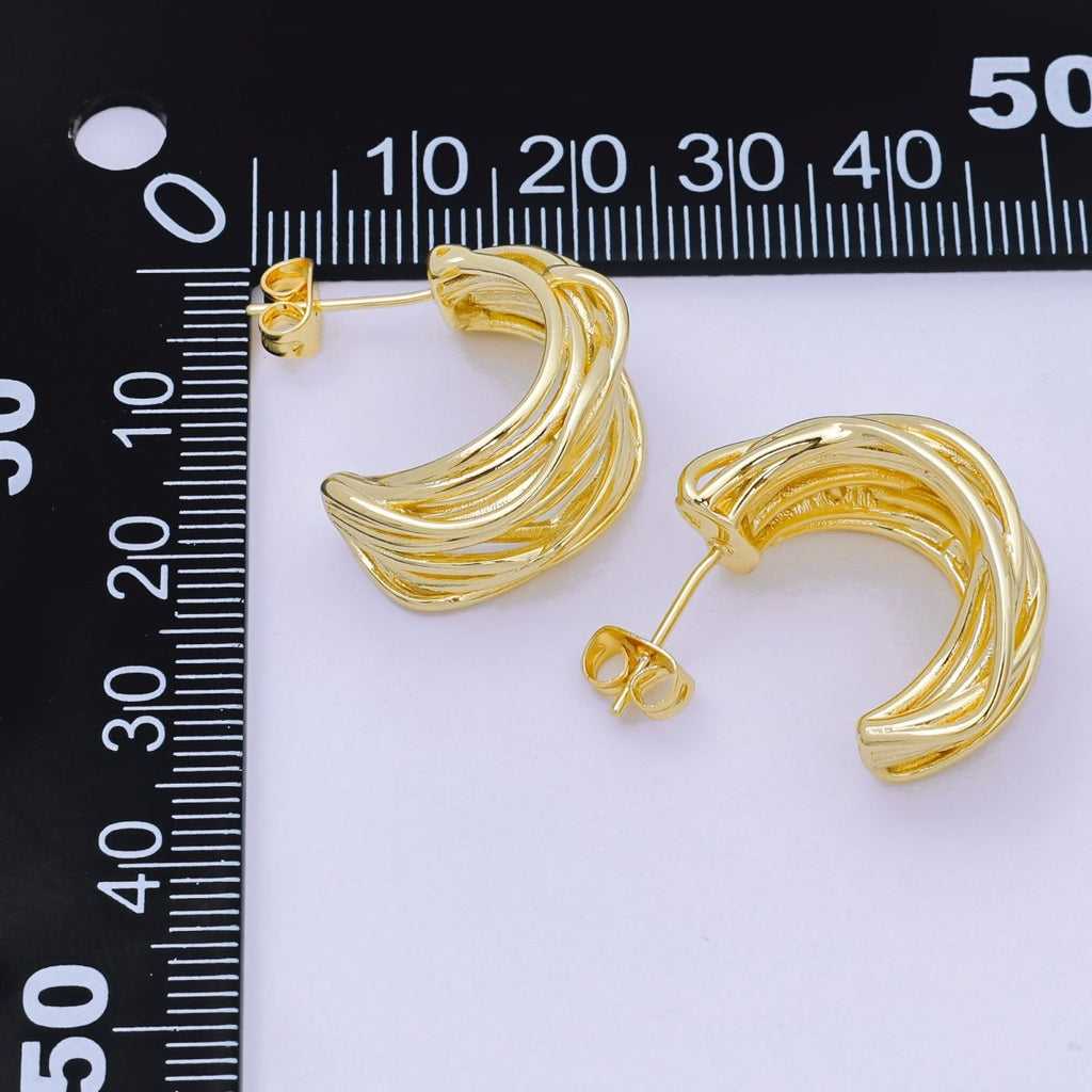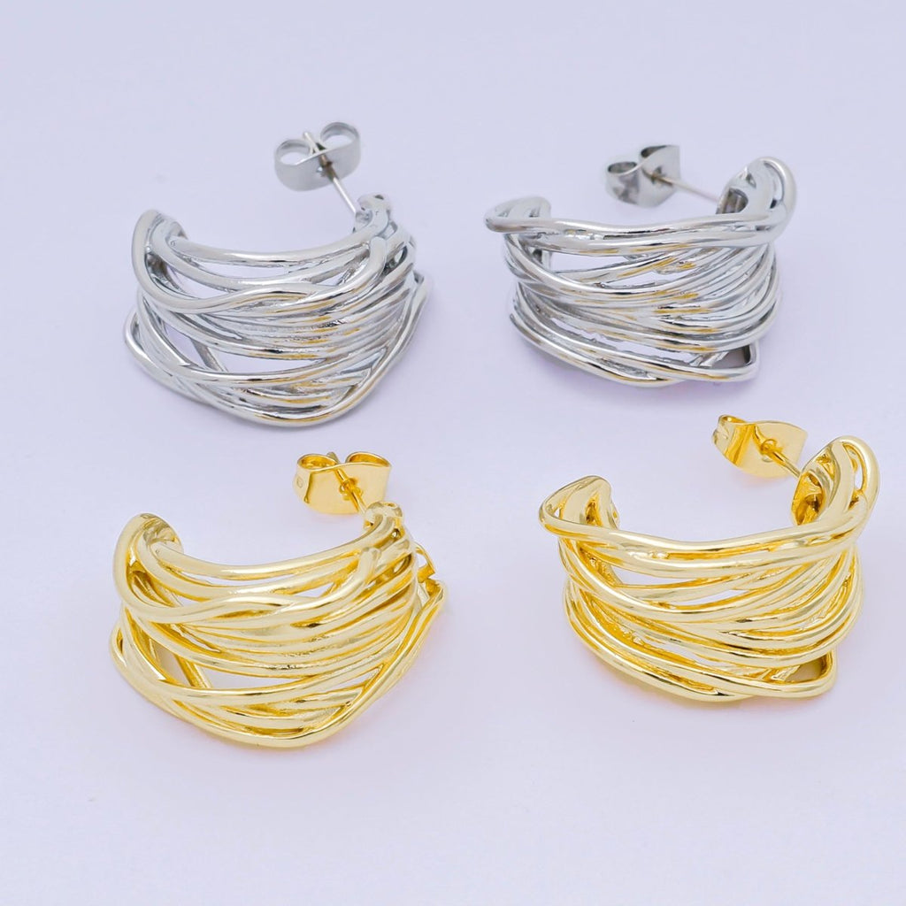24K Gold Filled Multiple Band Lined C-Shaped Hoop Earrings in Gold & Silver | AJ140 AJ141