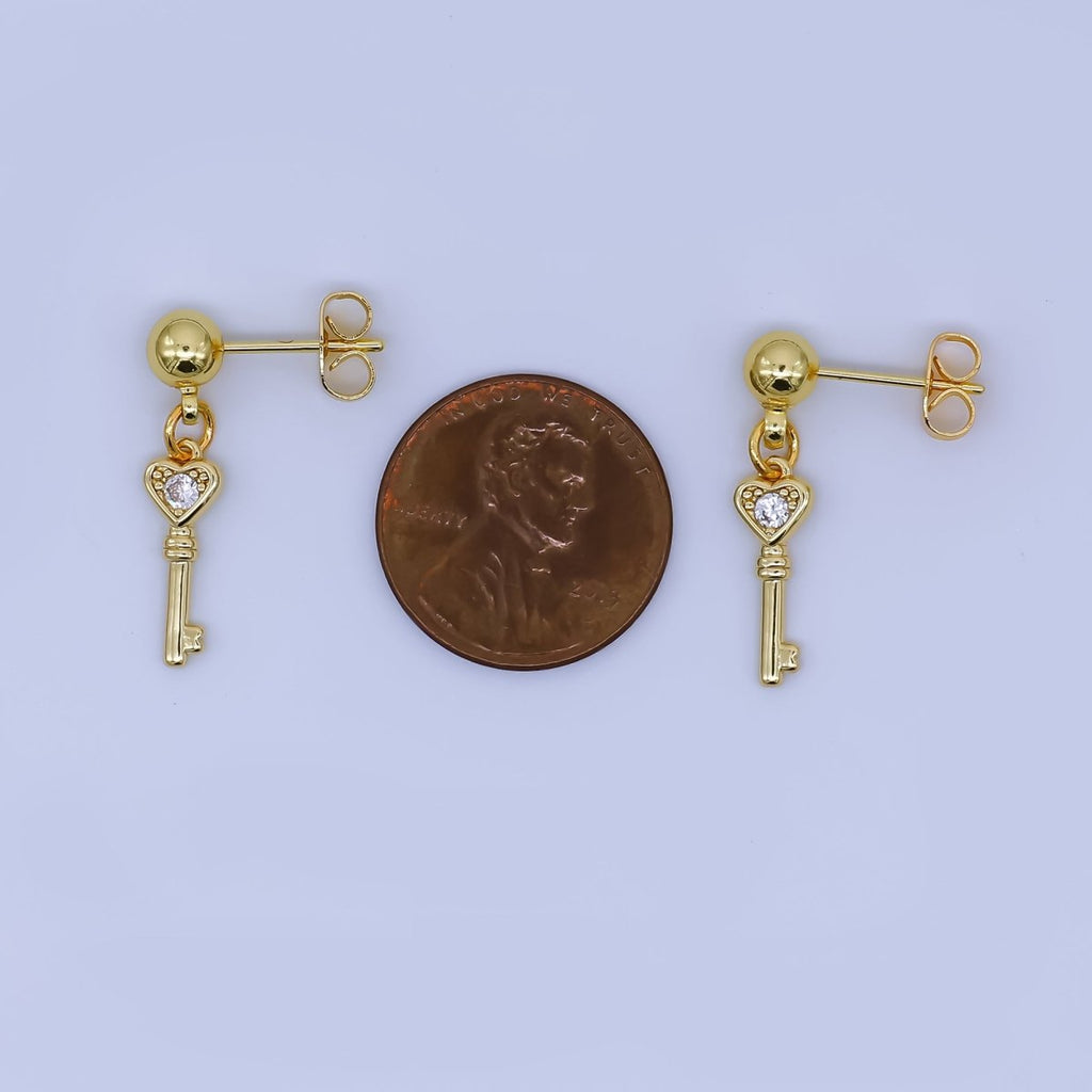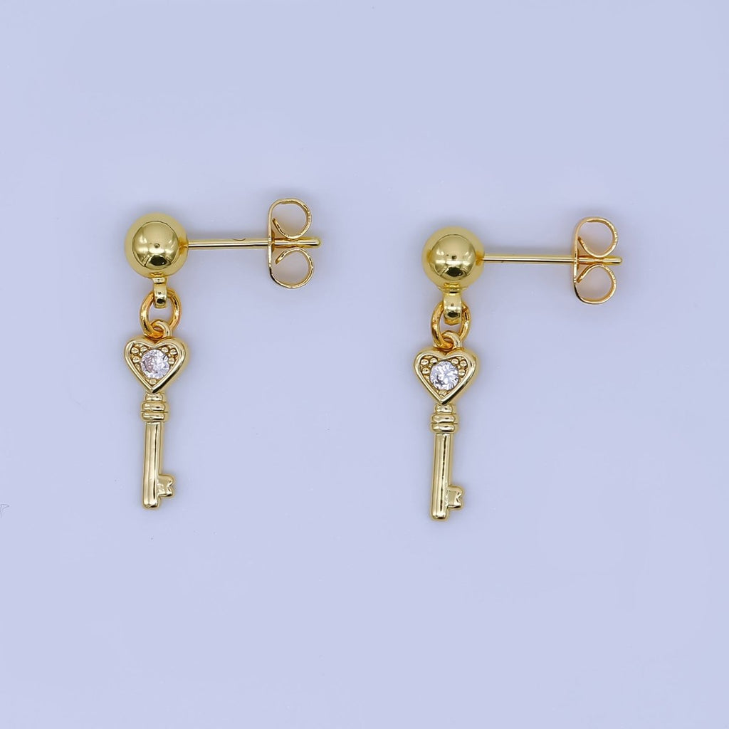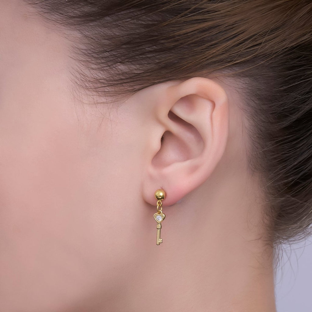 24K Gold Filled Round CZ Key to the Heart Drop Stud Earrings | AI468