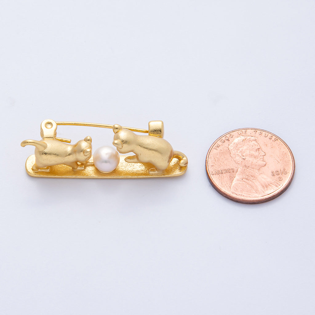 Gold 12mm x 35.7mm Pearl Two Kitten Cats Pet Playing Animal Pin Brooch | BH-012