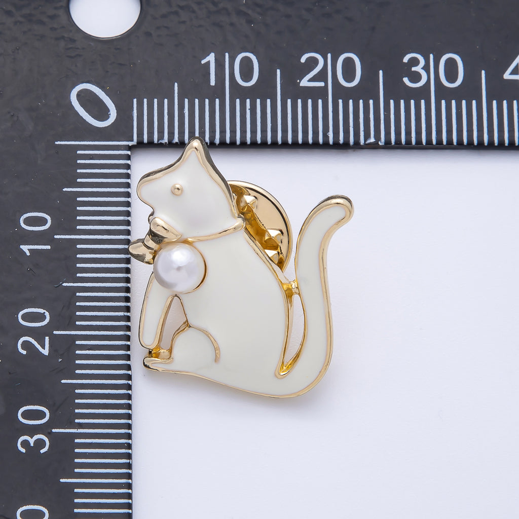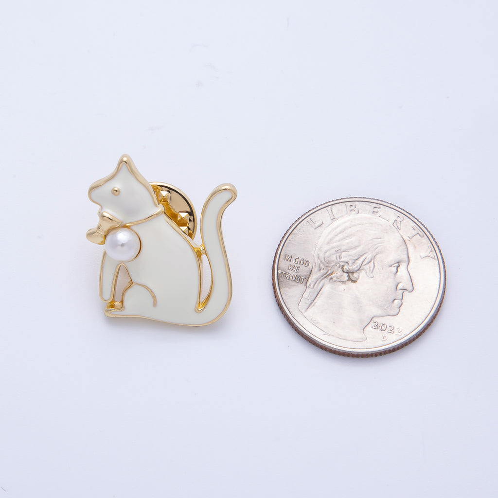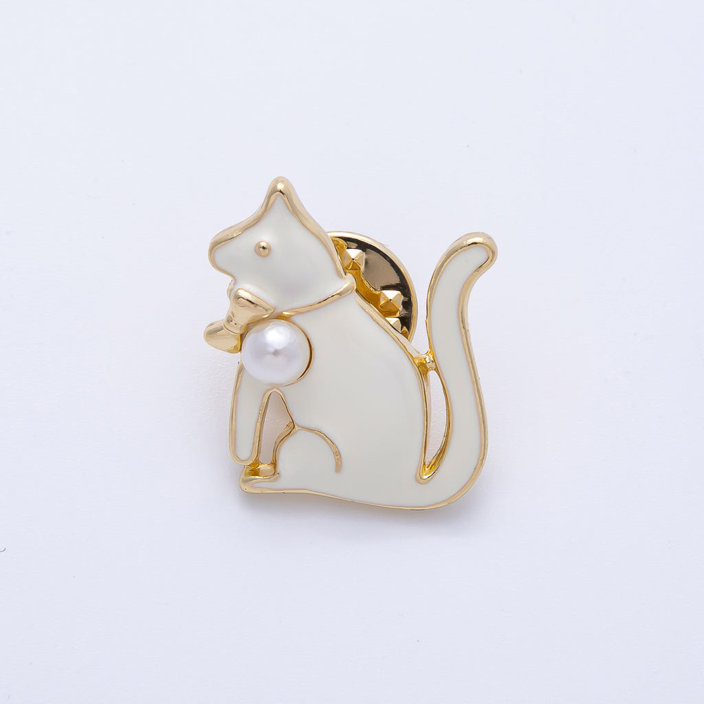 Gold 23.5mm x 21mm White Acrylic Pearl Enamel Cat Kitten Pet Pin Brooch | BH-047
