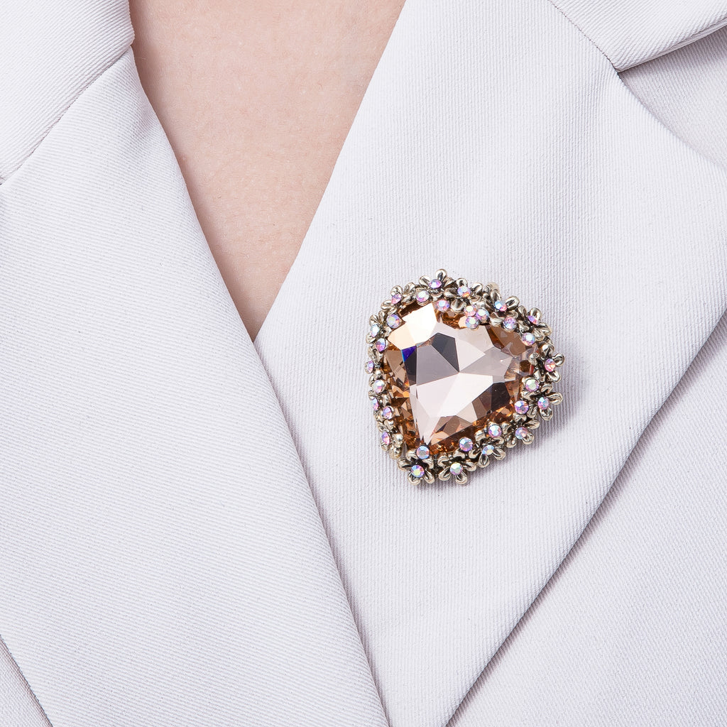 Gold 37mm x 36mm Orange Rhinestone Heart Pin Brooch | BH-067