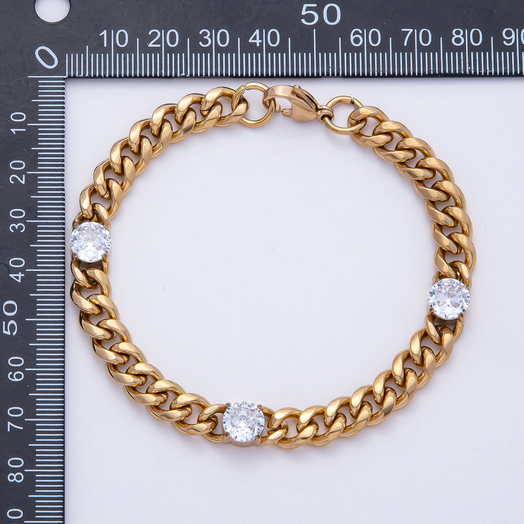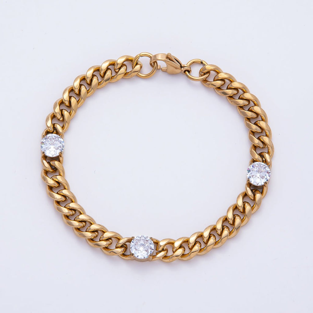 Gold Stainless Steel 8mm Triple CZ Curb Chain 8.66 Inch Bracelet | WA-04036