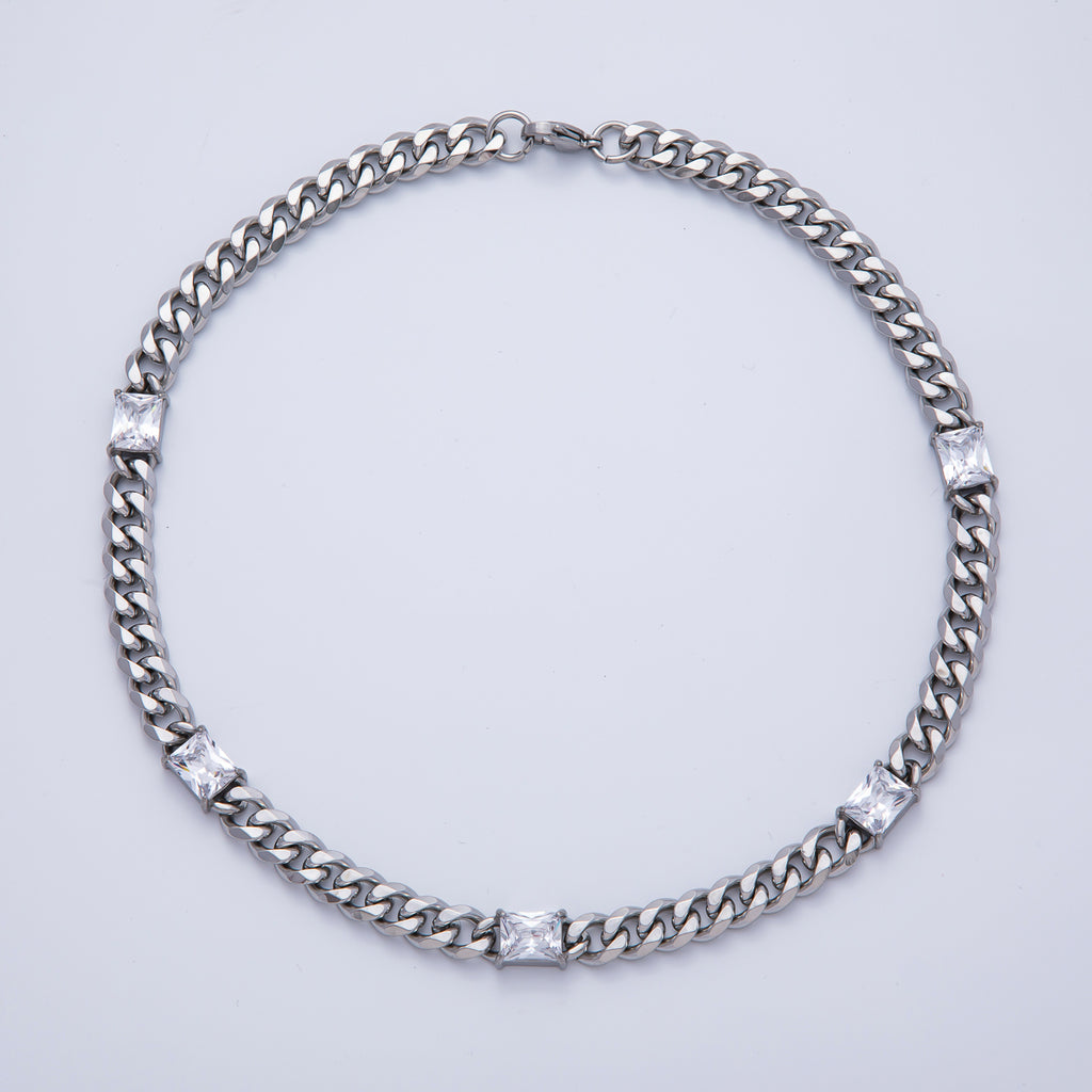 Stainless Steel 9.5mm Clear CZ Baguette Curb Chain 18 Inch Necklace in Gold & Silver | WA-3943 WA-3944