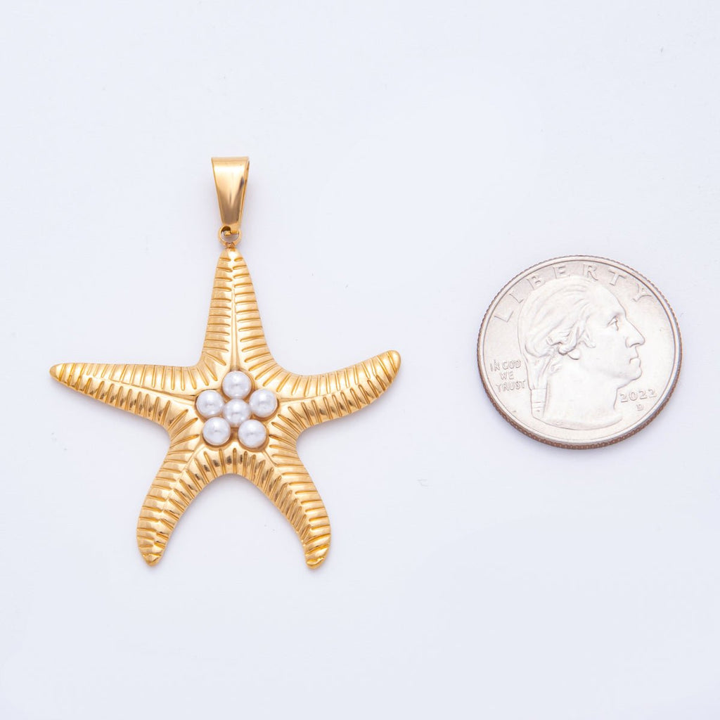Stainless Steel Shell Pearl Lined Ribbed Starfish Pendant | J541