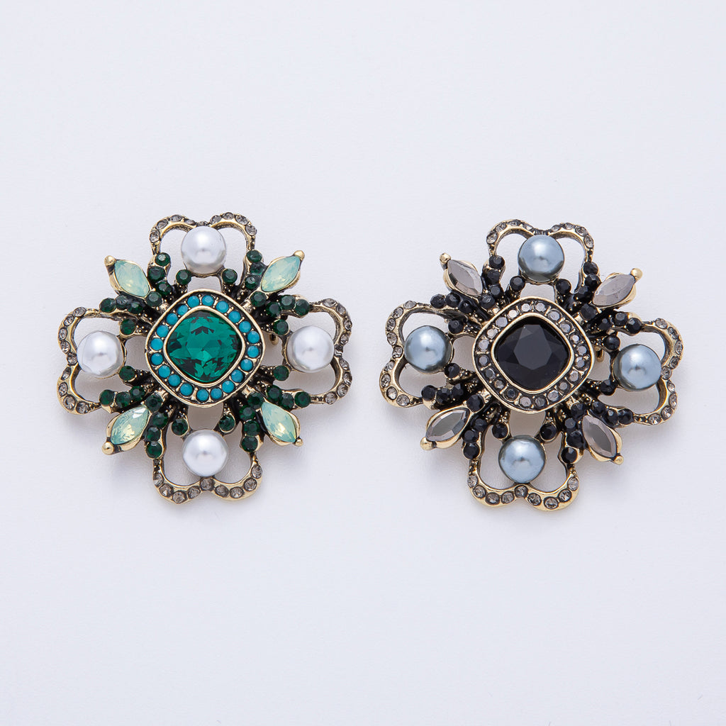 Vintage Antique Gold Flower Blue Black Gray Crystal Brooch Pin | BH-006
