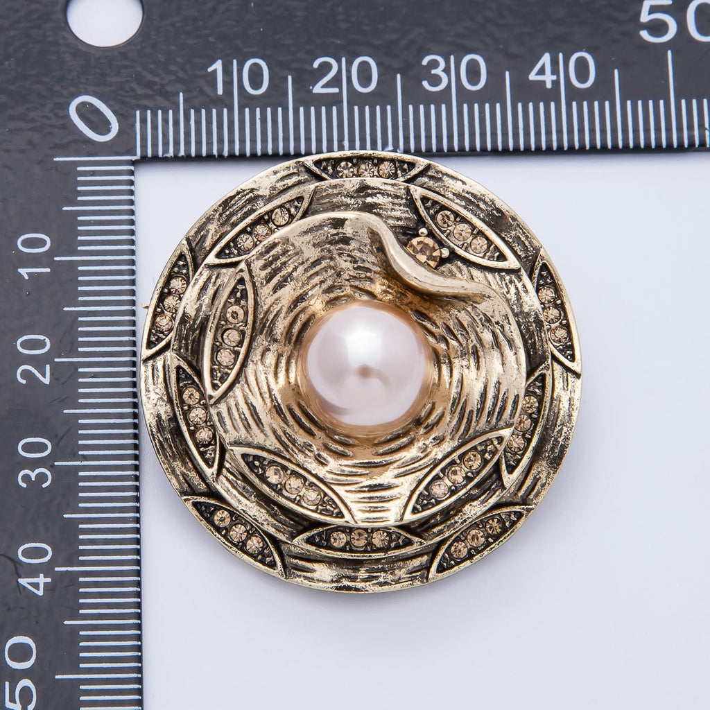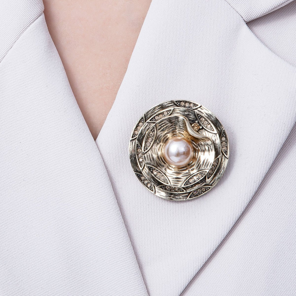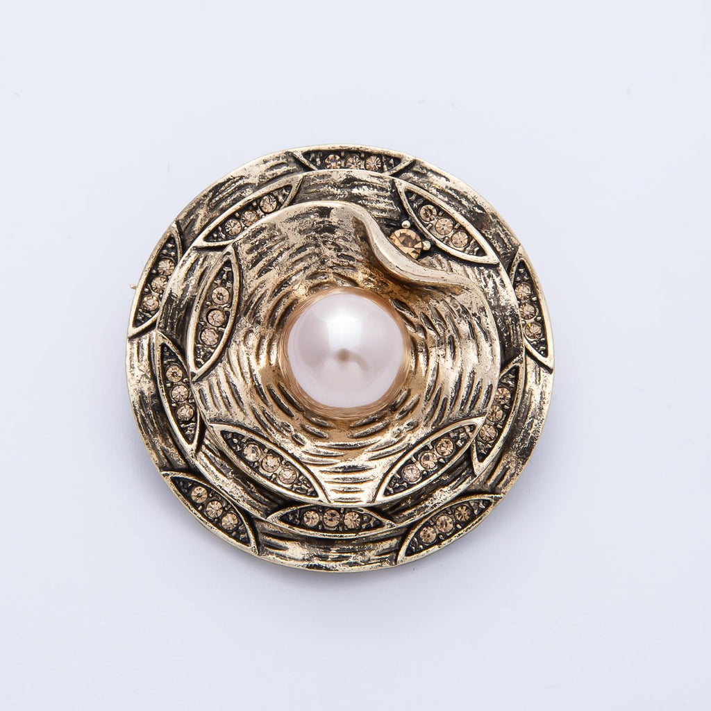 Vintage Gold 39.5mm x 39mm Pearl Geometric Round Pin Brooch | BH-078